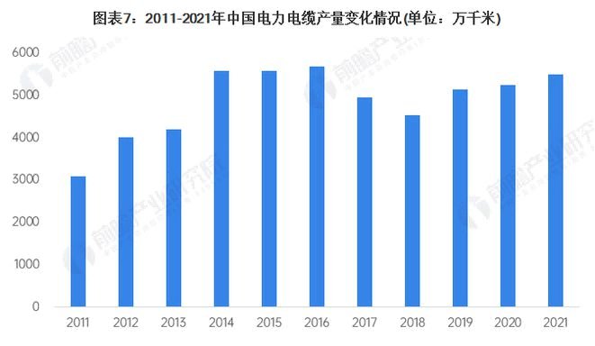 國家統計局數據顯示,2011年以來(lái),我國電力電纜總產(chǎn)量整體呈現震蕩走勢。在經(jīng)歷2017-2018年連續兩年產(chǎn)量規模下滑之后,2019年,我國電力電纜總產(chǎn)量規模有所回升,整體規模達到5141萬(wàn)千米,同比增長(cháng)13.44%。2021年,隨著(zhù)疫情逐步好轉,國內電力電纜產(chǎn)量達到5480萬(wàn)千米,同比增長(cháng)4.52%。