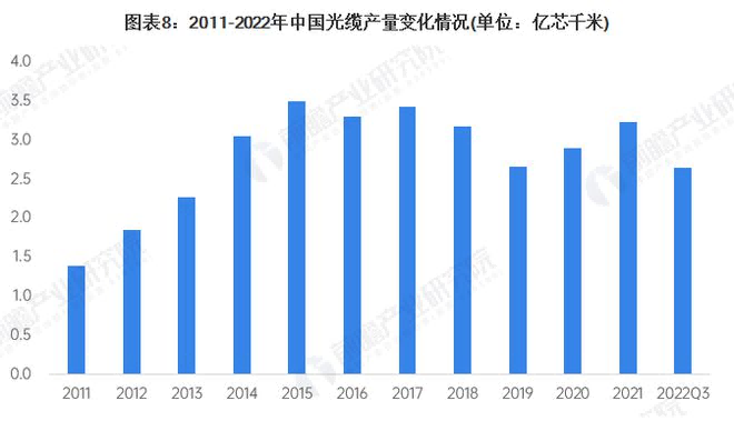 光纜方面,國家統計局數據顯示,2011-2021年,我國光纜產(chǎn)量整體呈波動(dòng)變化。2021年下半年以來(lái),尤其是2021年10月以來(lái),中國移動(dòng)、中國電信等運營(yíng)商對普通光纜產(chǎn)品等集采招標呈現量?jì)r(jià)齊升的趨勢,采購規模和價(jià)格均較上年實(shí)現較大幅度上升。一直到2022年上半年,中國聯(lián)通和中國廣電也進(jìn)行了相關(guān)光纜產(chǎn)品的集采。2022年前三季度,國內光纜產(chǎn)量累計值達到2.64億芯千米,光纜產(chǎn)量累計增長(cháng)11.5%。