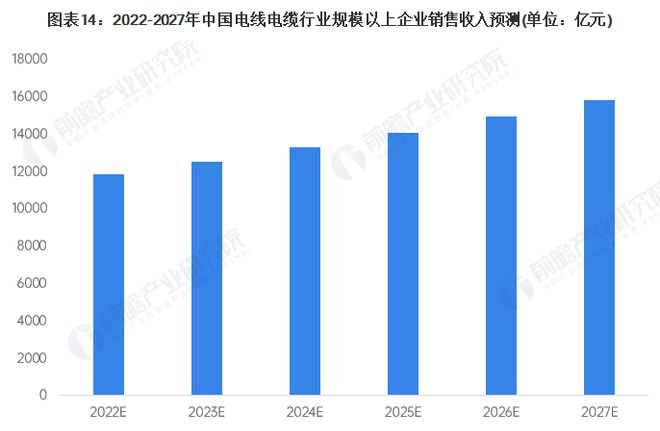 南網(wǎng)電網(wǎng)明確提出,“十四五”期間規劃投資約6700億元,以加快數字電網(wǎng)建設和現代化電網(wǎng)進(jìn)程,推動(dòng)以新能源為主體的新型電力系統構建。根據國家對電線(xiàn)電纜主要應用領(lǐng)域-電力(新能源、智慧電網(wǎng))、軌道交通、航空航天、海洋工程等規劃來(lái)看,未來(lái)我國電線(xiàn)電纜行業(yè)前景向好,行業(yè)產(chǎn)品升級趨勢明顯。預計到2027年,中國電線(xiàn)電纜行業(yè)規上企業(yè)銷(xiāo)售收入接近1.6萬(wàn)億元。